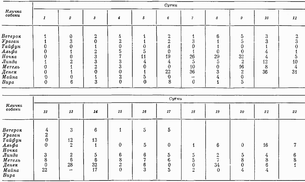 В начальные сутки опытов у многих животных поведение было значительно изменено. Собаки почти все время находились в активных позах, много прыгали, вертелись, у них часто регистрировались продолжительные двигательные реакции большой интенсивности. Одна из них (Ветерок) находилась в беспокойном состоянии более 14 час. в сутки. При этом она не проявляла усталости и интенсивно реагировала на многие внешние воздействия. Две другие (Тайфун и Ураган) также упорно двигались. У Тайфуна регистрировалось большое количество движений, возникающих без видимых внешних раздражителей. Животное часто уставало, о чем свидетельствовал факт смены интенсивных движений расслабленными позами. У Урагана большое число гипертрофированных двигательных образований сменялось относительно спокойным состоянием. За час бодрствования в конце 1-х суток в среднем у этих трех животных с помощью актограммы фиксировалось 164 движения при средней их амплитуде 12,1 мм.