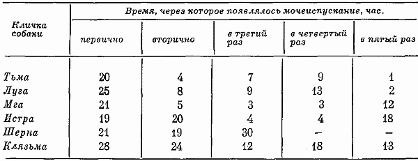В начале тренировки, так же как и при первом способе, отмечались задержки испражнений: моча впервые появлялась только через 20–35 час. Однако в этих экспериментах в противоположность первому способу тренировки не было обнаружено задержек мочеиспускания по 40 час. и более. Этих актов дольше всего не было у собак Клязьмы и Луги, у Клязьмы затем ритм мочеиспускания быстро нормализовался. Второй раз моча и кал у всех животных появлялись гораздо скорее. Третий и четвертый, т. е. при последующих мочеиспусканиях, интервалы между выделениями были почти нормальными и превышали 7 час. только в том случае, если разделялись ночными часами, когда и в норме эти акты осуществлялись значительно реже. Все эти материалы отражены в табл. 9.