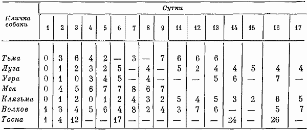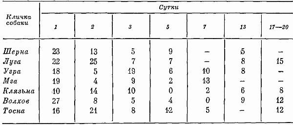 Позные состояния. В переходный период животные 68% времени по данным наблюдения находились в активных позах. Расслабленные положения тела регистрировались больше глубокой ночью. Иногда днем наблюдалось возникновение сидячих пассивных поз, что объяснялось значительным ухудшением общего состояния собак. Тосна в основном стояла. В позах покоя она находилась только 16% времени, т. е. менее 4 час, пассивные сидячие позы были для собаки особенно характерным явлением.