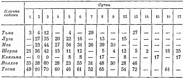Поведение двух собак (Тосны и Волхова) этой серии требовало особого рассмотрения. Обеих характеризовала чрезмерная двигательная активность и ее неизменность, несмотря на удлинение времени пребывания в опыте. Тосна двигалась 18 час. в сутки (15 из них весьма интенсивно), Волхов — 16 час, что вначале служило причиной их объединения в одну группу. Однако затем были выявлены многие различия в поведении этих собак.