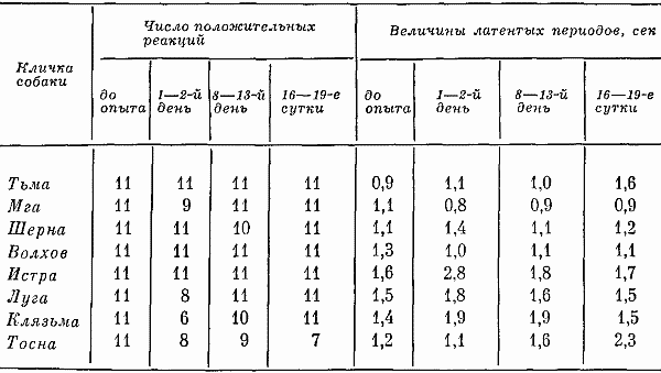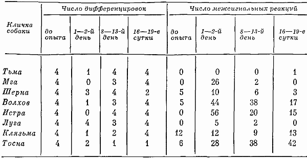 До начала экспериментов условные рефлексы всех собак обладали большой прочностью: собаки реагировали на все положительные раздражители с латентным периодом 1–2 сек., реакции на дифференцировочные раздражители отсутствовали, межсигнальные регистрировались в небольшом числе.