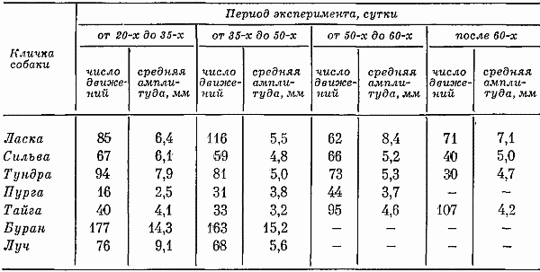 После 20-х суток двигательное состояние собак существенно не изменялось и только у двух из них наблюдались отклонения. Малоподвижная собака Пурга стала двигаться значительно больше. Собака Буран двигалась возбужденно в одни периоды и становилась неактивной — в другие: лежала и сидела в расслабленных позах, почти не реагируя на воздействия внешней обстановки. В дальнейшем у большинства животных по мере удлинения экспериментов наблюдалось сокращение числа движений и большая их вялость, а после 30 дней резко уменьшилось число компенсаторных движений. Исключение составляла одна собака (Буран), продолжающая возбужденно двигаться в одни периоды и становящаяся неактивной — в другие. С 40-х суток опыты с ней пришлось прекратить из-за палакиурезиса, как и с собакой Тосной во время изучения тренировки по второму способу.
