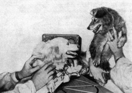 В описанных ниже исследованиях, проведенных в плане отбора и подготовки животных, изучалось влияние вибрации на реакции центральной нервной системы собак. Характеристики вибраций соответствовали тем, которые предполагались при выведении космических кораблей на орбиту: 70 гц при амплитуде 0,4 мм, длительности 6 мин. (Георгиевский, Юганов, 1962). Использовался вибратор ВП-70. На рис. 28 и 29 показана подготовка и проведение этих экспериментов. Каждая собака подвергалась вибрированию от пяти до десяти раз. Опытам предшествовала тренировка собак, находящихся на станке вибростенда. Систему выработанных условных рефлексов проверяли непосредственно за 10–15 мин. до вибрирования, через 5–7 мин. после того, как выключался вибратор, и затем еще раз, спустя 20–25 мин.