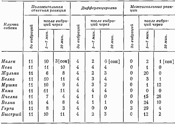 У одной собаки регистрировалось всего одно выпадение положительной реакции через 5 мин. и два через 20 мин., ухудшались реакции на дифференцировочные раздражители, появлялись межсигнальные реакции. У другого животного через 5–7 мин. после выключения вибратора нарушения были относительно незначительными, а через 20 мин. собака спала.