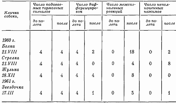 Далее описываются материалы, полученные при изучении реакций нервной системы животных после космических запусков. Исследовались четыре собаки. Пять животных по отношению к этим четырем собакам составляли контрольную группу: их возили на космодром и привозили обратно, а также подвергали всем другим процедурам. Проверка системы выработанных условных рефлексов проводилась за 1–4 дня до их отправки на космодром и в течение суток после приземления (они возвращались, поступали в виварий, их мыли, подвергали ветеринарному и медицинскому осмотру). Если у собак перед исследованием условнорефлекторной деятельности пищевое возбуждение было выражено недостаточно, их не кормили в течение 8 час, предшествующих эксперименту с подачей условных раздражителей.