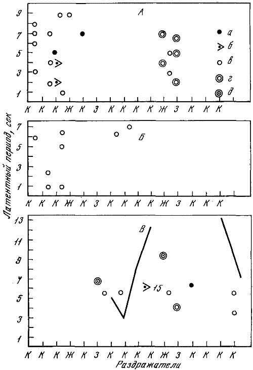 Резкими были изменения в поведении собак. Стрелка в периоды активности тихонько скулила, в другие моменты лежала, часто отвернувшись от табло с раздражителями, не реагировала на щелчки аппарата, шум, производимый экспериментатором, и т. д. Белка в периоды неактивности стояла, смотрела на панель с сигнальными лампочками, реагировала на побочные раздражители, иногда начинала беспорядочно нажимать на крышки-педали, одно-двухразовые нажимы превращались в беспорядочные и торопливые движения, часто отмечались только взмахи лапой над педалями или нажимы с силой меньшей, чем 15 г.