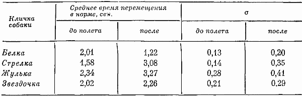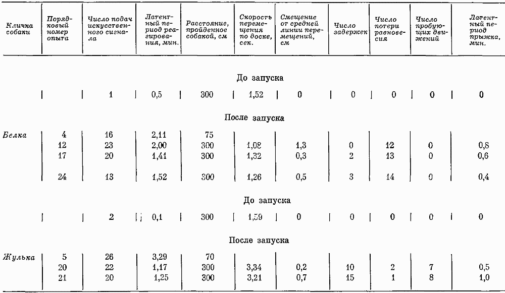 Интересным феноменом было появление движений, которые не наблюдались до запуска, а после запуска у Жульки, Стрелки и Звездочки получили широкое распространение. Условно такие действия были названы пробными. Собаки, находясь на доске, делали попытку поставить на очередную позицию переднюю лапу, но, еще не начав перемещать на нее центр тяжести, переставляли эту лапу в исходное положение, а затем в другое место. Иногда пробные движения имели еще менее завершенную форму: животные проводили лапой или дотрагивались ею до поверхности доски и тут же убирали ее снова. В ряде случаев они ограничивались подобным движением, не касаясь доски. Все это свидетельствовало о том, что после запуска собаки не могли в оценке опорных поверхностей ограничиваться показаниями зрительного анализатора и в наиболее ответственные моменты привлекали также и другие виды ориентировки.