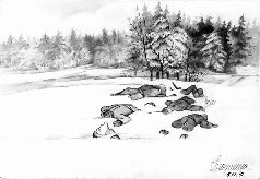 – На рассвете следующего дня ты должен взять деревню Алексеевское. Застегнув планшет, я вышел на крыльцо, посмотрел на свое засыпанное белым снегом войско, глубоко вздохнул, достал из-за пазухи меховые рукавицы, привычным движением руки поправил поясной ремень и сошел по ступенькам крыльца. Ну вот, все теперь на месте. Теперь можно подать команду на выход. Помалу, не торопясь, мы спустились в низину, к опушке леса, дошли до развилки дорог, свернули на ухабистую, очищенную от снега дорогу и поплелись неизвестно куда. (вперед). В ночь на 10-е декабря пятая стрелковая рота подошла к деревне (Гусьино). На дороге, не выходя из леса, я остановил роту и велел солдатам ждать нашего возвращения. С командирами взводов и небольшой группой солдат мы вышли на опушку леса, чтобы осмотреть впереди лежащую местность. От опушки леса до деревни оставалось метров пятьсот. Деревня лежала в низине на фоне снежной высоты, которая уходила круто вверх, закрывая собой полнеба. Из-за стволов деревьев видны были деревенские избы, сараи и огороды, глубоко торчащие в снегу. В деревне не было видно огней, дыма из печных труб, ни заметного на глаз движения. Мы долго смотрели туда, и потом я сказал: «Ну вот что, Черняев! На опушке леса, вот здесь и здесь поставишь часовых. Будете смотреть за деревней. Ты лично останешься здесь и будешь проверять дежурных. Мы с Сениным вчера были в деле, брали деревню, нам нужно отдохнуть. Теперь твоя очередь! Выводи сюда свой взвод и готовь к утру своих солдат, пойдете на деревню! Мы Сениным вернемся в лес. Стариков на ночь в наряд не ставь! Они и так на пределе. На дежурство подбери молодых. Считай, что я ушел! С деревни глаз не спускать!». Черняев остался, а мы с Сениным вернулись в роту.