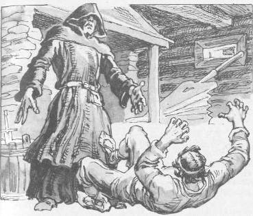Кузнец, сжимая руки монаха своими железными пальцами, стал подталкивать его обратно к чулану. Однако, к своему несказанному изумлению, он не только не смог ни на шаг сдвинуть монаха с места, но, кроме того, тут произошло нечто такое, что кузнец вообще считал невозможным. Монах вдруг обхватил обеими руками мощное тело кузнеца и так крепко сжал его в своих объятиях, что у Виллу захрустели кости и захватило дух. Спина кузнеца, которую до сих пор ни единому смертному не удавалось согнуть, выгнулась дугой, он ослабел, почувствовал, что у него подкашиваются ноги, и только тогда смог перевести дух и прийти в себя, когда оказался на полу; лежа на спине у ног монаха, он услышал, как тот произнес глухим и печальным голосом: