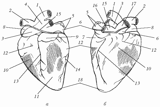 а – слева; б – справа: 1 – аорта; 2 – плечеголовной ствол; 3 – легочный ствол; 4 – артериальная связка; 5 – легочные вены; 6 – левое предсердие; 7 – левая непарная вена; 8 – правое ушко; 9 – левое ушко; 10 – правый желудочек; 11 – левый желудочек; 12 – субэпикардиальный жир; 13 – межжелудочковые борозды; 14 – кровеносные сосуды сердца; 15 – линия прикрепления перикарда; 16–17 – полые вены; 18 – верхушка сердца