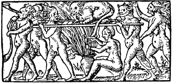 («De Sagis».)Эта гравюра на дереве изображает нагую ведьму, которая готовит колдовской напиток в окружении таких же нагих животных-демонов.