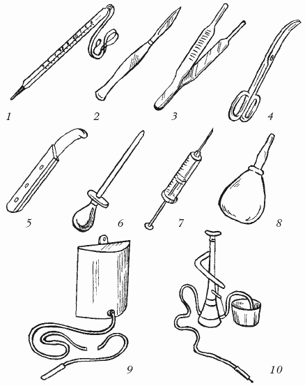 1 – ветеринарный термометр; 2 – скальпель; 3 – анатомический пинцет; 4 – кривые ножницы; 5 – копытный нож; 6 – троакар; 7 – шприц; 8 – спринцовка; 9 – клистирная кружка; 10 – гидропульт