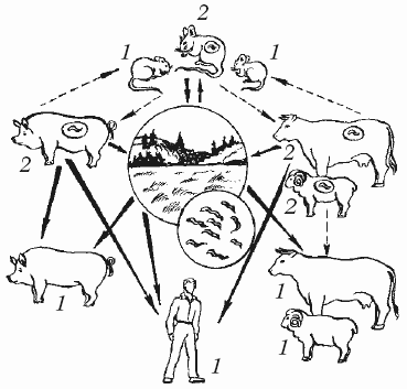 1 – здоровые животные и человек; 2 – лептоспироносители (непрерывная стрелка – постоянная связь, пунктирная линия – непостоянная связь)