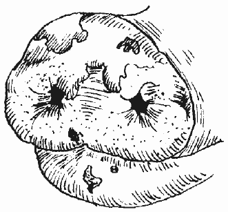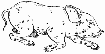 Оспа свиней характеризуется одновременным появлением на разных участках тела (чаще на слабо покрытых щетиной) розеол (красных, четко очерченных пятнышек величиной с чечевицу, не возвышающихся над поверхностью кожи и исчезающих при надавливании, но появляющихся вновь при прекращении давления) и узелков, которые быстро превращаются в желтовато-серые гнойнички, сливающиеся в пятна размером 2-2,5 см, на которых потом появляются корочки (рис. 23). Все это сопровождается зудом, расчесами и шаткой походкой, иногда поносом. Оспа свиней длится около 20-30 сут, но может затягиваться до 45-60 сут, особенно при появлении вторичных оспин. Переболевшие животные приобретают пожизненный иммунитет.