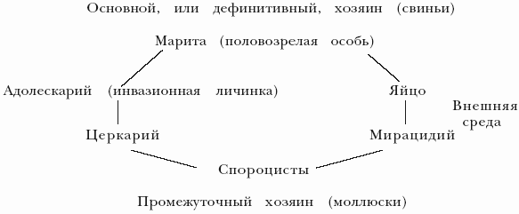Трематодозы – инвазионные болезни, возбудителями которых являются черви класса трематоды, или сосальщики. Цикл развития трематод представлен на схеме 1. У свиней трематодозы встречаются относительно редко.
