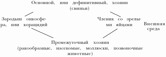 Основным хозяином эхинококка являются собаки и другие плотоядные, которые заражаются, поедая трупы павших животных или субпродукты с эхинококковыми пузырями. В организме собак из вооруженных сколексов (головки) через 38-97 сут развиваются ленточные цестоды длиной до 6 мм, состоящие из 3-4 члеников, последний из которых зрелый и наполненный яйцами (рис. 33). Этот членик выделяется во внешнюю среду, где яйца загрязняют собой траву, почву, воду и т. д. При заглатывании яиц с кормом или водой происходит заражение промежуточного хозяина (свиней и других млекопитающих). В их организме яйца разносятся по всем органам и тканям, где медленно развиваются до ларвальной, или личиночной, стадии. В личиночной стадии возбудитель представляет собой однокамерный пузырь, наполненный жидкостью и окруженный двухслойной оболочкой, где содержится зародыш сколекса с крючьями. У свиней пузыри со сколексами развиваются через 11 мес после заражения. Рост их длится годами, достигая значительных размеров (до 5-10 см в диаметре).