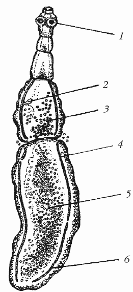1 – присоска; 2 – половая бурса; 3 – семенник; 4 и 6 – экскреторный (выделительный) канал; 5 – матка