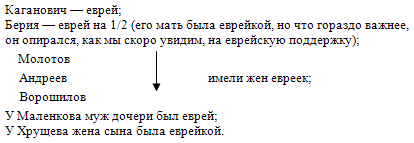 Когда Сталин будто бы изложил этот план своим соратникам, он столкнулся с сопротивлением: Каганович выступил против и даже разорвал своё удостоверение члена Президиума ЦК. Сталин предложил голосовать — все оказались против него. В первый раз в жизни встретив оппозицию своих соратников, Сталин пришёл в такое возбуждение, что с ним случился удар, от которого он так и не оправился. Стоит попытаться продумать этот рассказ, как становится очевидной его полная неправдоподобность. Сталин и любое другое окружение не могли бы в то время (если бы даже хотели) найти опору в партии для такой грандиозной акции. Вот как описывает, например, Авторханов еврейское влияние в Политбюро того времени («Загадка смерти Сталина»). Из 11 членов Политбюро: