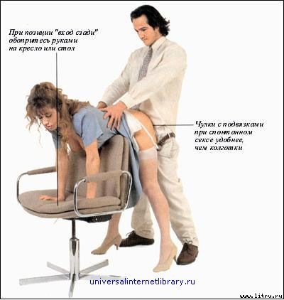 В большом жестком кресле можно заниматься сексом в нескольких позициях. Одна из них показана на снимке. Кроме того, мужчина может сесть, а женщина — устроиться у него на коленях.