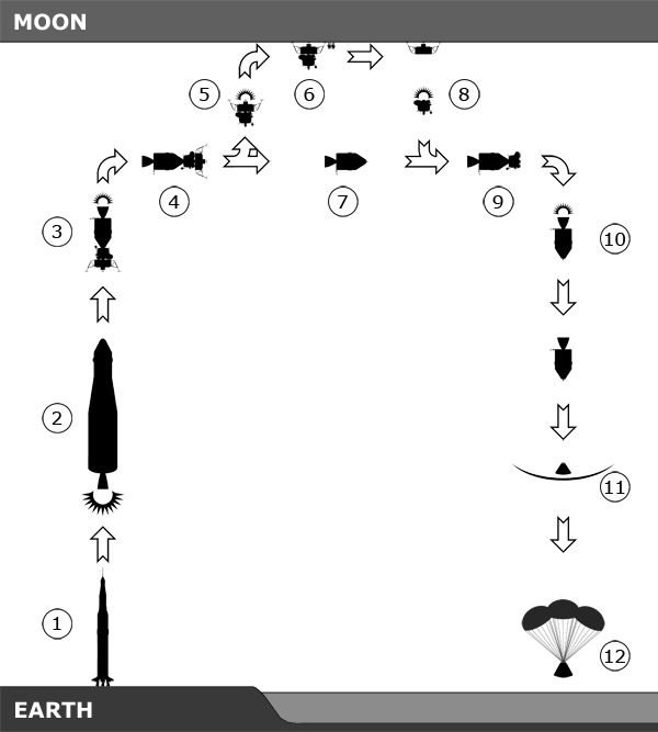 1. Вывод лунного комплекса массой ок. 135 тонн, состоящего из командно-служебного модуля (Apollo CSM) с экипажем 3 человека, лунного экспедиционного модуля (Apollo LM) и третьей ступени S-IVB на низкую околоземную орбиту ракетой-носителем «Saturn-V».