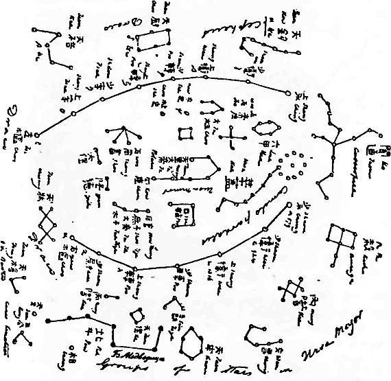 Рис. 17. Китайская звездная карта XIX века. Северное полушарие. Карта очень груба и неполна. Взято из [544], т. 6, с. 64.