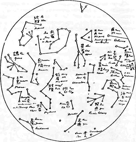 Рис. 18. Китайская звездная карта XIX века. Южное полушарие. По поводу этих карт Н.А. Морозов писал: «Для ознакомления с наивностью китайской астрономии даже в XIX веке, я предлагаю эти шесть китайских звездных карт из книги Джона Вильямса… Читатель сразу узнает… Большую Медведицу, а остальные едва ли… Почти все не очень типичные звездные сочетания неба, благодаря отсутствию координатной сети, распределены здесь так детски наивно, что отождествить их с реальными звездными конфигурациями часто невозможно» [544], т. 6, с. 64, 69. Взято из [544], т. 6, с. 69.