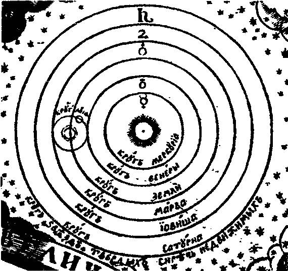 Рис. 2. Старинное изображение Коперника и его системы мира с центром в Солнце в «Глобусе Небесном» Василия Киприанова. Взято из [90], с. 212.