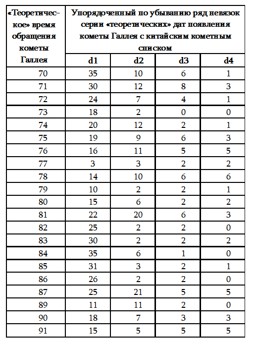 Таким образом, чем меньше значения во 2–5 столбцах таблицы, тем лучше соответствие между стоящим в первом столбце «временем обращения» кометы Галлея и китайским кометным списком.