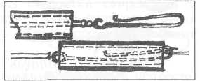 На зимней рыбалке замена блесны или поводка жерлицы связана с неудобствами. Предлагается карабинчик, который позволяет производить замену без хлопот и быстро. Он изготовлен из медной проволоки толщиной 0,8 мм и кусочка хлорвиниловой трубки. Проволока изгибается в виде крючка, ее верхний конец закручивается в колечко и опаивается. К этому колечку и привязывается основная леска, а на карабинчик с небольшим усилием надевается трубочка. Для смены снасти трубочку надо поднять вверх, на крючок карабинчика надеть заводное кольцо блесны или петельку поводка жерлицы, а трубочку снова опустить вниз (рис. 2.8).