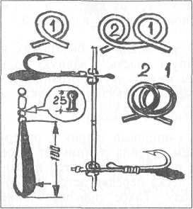 Для ловли в море на «самодур» желательно жесткое спиннинговое удилище с леской диаметром 0,4–0,6 мм, катушка предпочтительнее большая. К основной леске, называемой «стволом», петля в петлю или через вертлюжок подвешивается «ставка» из более тонкой лески, к которой на коротких проводочках привязаны жалом кверху несколько крючков (рис. 2.7).