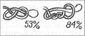 Петля на леске, вернее ее узел, — самое уязвимое место. Надо выбирать узел большой прочности, что избавит вас от увеличения диаметра лески при закреплении на ней блесны (рис. 2.9). На левом рисунке показана наиболее часто применяемая петля с узлом, которая снижает прочность лески почти наполовину. Более прочный узел показан на правом рисунке. Им и надо пользоваться, подбирая леску для блесны.