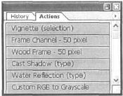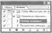 Действие, оно же Action, представляет собой записанную последовательность команд меню, движений, произведенных инструментами, и т. д. Список довольно велик. Имеется замечательная возможность сохранять последовательность небольших шагов и вкладывать их всего лишь в один Action (Действие), для подготовки некоторого числа изображений к печати. Или для перевода группы изображений в определенный цветовой режим.