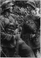 24 июля, как уже отмечалось выше, в состав дивизии вернули 10-й разведывательный батальон СС Хайнриха Бринкманна. Бои не прекращались ни на день. 26 июля на командный пункт батальона пригнали несколько десятков пленных британцев, взятых в районе высоты 112. Унтершарфюрер СС Франц Видманн вспоминал: «В этот момент командир дивизии Хайнц Хармель посетил командный пункт, чтобы увидеть пленных "Томми" [110] . Он уводит с собой двух английских офицеров. Мы предлагаем пленным немецкие сигареты, но они отказываются. Рядом с нами позиция «Небельвеферов», и когда они стреляют (при стрельбе "Небельвеферы" издавали характерный вой. — Р.П.), пленные в страхе бросаются на землю» [111] .
