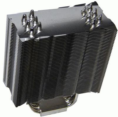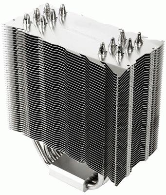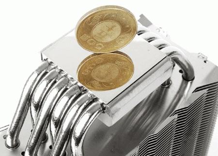 Перед нами по-прежнему вертикальная «башня» с шестью U-образными тепловыми трубками, пронизывающими алюминиевый пластинчатый радиатор в "шахматном порядке", никелированное медное основание. Трубки выстроены в ряд — откровенно говоря, вашему покорному слуге такое построение не нравится, т. к. распределение по площади пластин очень неравномерное, получается, что трубки просто собраны в кучку.
