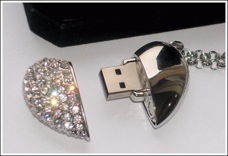 В наших широтах пользуются популярностью и другие "влюбленные телефоны" — обклеенные кристаллами Сваровски. Говорят, перед 14 февраля спрос на них превышает предложение… А ещё бывают такие флэшки, да ещё и в виде сердца: они разламываются пополам, обнажая USB-штекер. Некоторые даже носят их на шее, рассказывая всем подряд, что это у них такой "умный кулон". На фотографии изображен серебристый образец, но в природе встречаются и розовые. Уж поверьте.