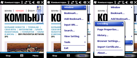 Как и в NetFront Browser третьего поколения, в «четвёрке» используется тот же скучный интерфейс, все элементы управления которого собраны в одном всплывающем меню. Явно устаревшее и не соответствующее современным веяниям решение. Хочется надеяться, что к моменту финального релиза продукта программисты ACCESS придумают и сварганят что-нибудь инновационное. Пока же о каком-либо прогрессе в интерфейсе говорить рано.