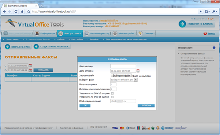 Первый сервис — Virtual Office Tools — интересен своей функциональной начинкой, позволяющей не только отправлять через Интернет факсы, но и принимать их (естественно, за дополнительную абонентскую плату). К рассылке система принимает только графические файлы формата TIFF, подготавливать которые можно как вручную, так и автоматизированными средствами клиентской программы FaxService, доступной для бесплатного скачивания в личном кабинете. По желанию пользователя служба может после отправки факса формировать соответствующий отчет и отправлять его на указанный e-mail. Примечательно, что при регистрации в Virtual Office Tools на личный счет кладется 5 рублей, которые можно потратить на отправку одной страницы документа на московский или санкт-петербургский номер (звонки в другие регионы России и страны стоят больше пяти целковых). Пополнить баланс можно посредством банковского перевода, пластиковых карт Visa, MasterCard и систем электронных платежей.