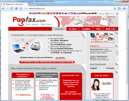Из заморских сервисов можем порекомендовать PopFax.com, интерфейс которого переведен на два десятка с гаком языков, включая русский. Судя по представленной карте тарифов, система поддерживает отправку факсов на российские телефонные номера по вполне приемлемым расценкам. Это первая отличительная особенность онлайнового инструмента, есть и вторая: PopFax.com позволяет рассылать факсы не только из браузера или по электронной почте через специальный шлюз, но и из окна клиентского приложения, доступного как для Windows, так и для операционных систем Mac OS X и Linux. В списке поддерживаемых системой файлов значатся документы Microsoft Office, OpenOffice.org, Abobe Acrobat, а также изображения форматов JPG, BMP, TIFF, GIF и др. Еще одной фичей службы является механизм рассылки уведомлений по e-mail и SMS. Оценить возможности факсимильного сервиса можно бесплатно (не более двух страниц в сутки), а для оплаты услуг придется обзавестись либо картами Visa, MasterCard, American Express, либо аккаунтом в платежной системе PayPal.