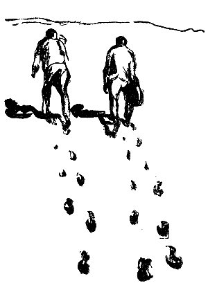 Наступило утро. Две крохотные фигурки упрямо шагали по необъятному царству песков. Тома опирался на руку Мкизе. Поднялось солнце. Пустыня сияла. Пустыня пила влагу из утомленных тел. Когда жара стала невыносимой, сели в тени большого камня. Тома просил воды. Генри дважды наполнял ему стакан. Сам выпил один.