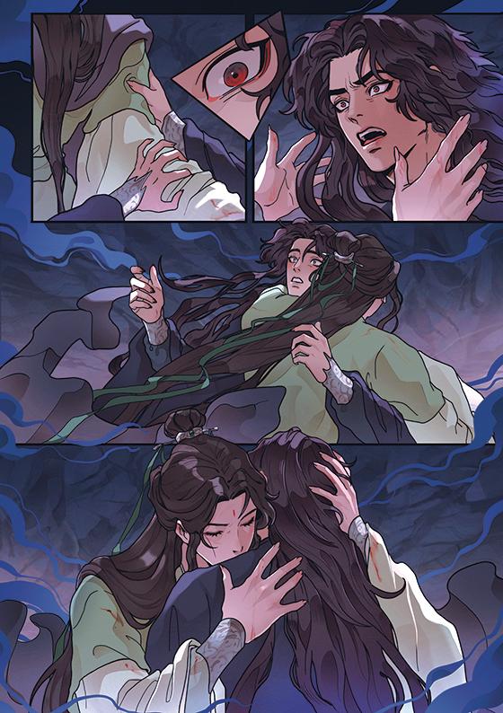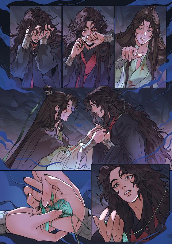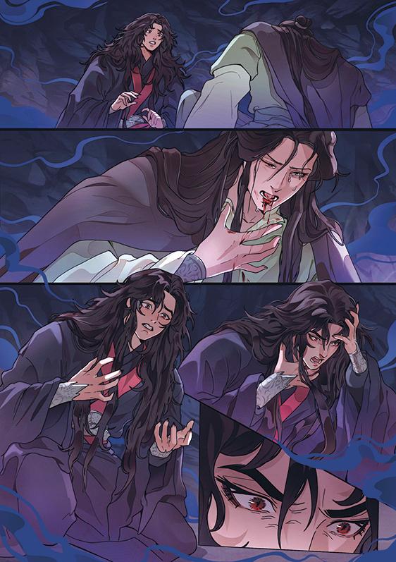 Внезапно Ло Бинхэ рассмеялся, не переставая лить слёзы. Схватив Шэнь Цинцю за руку, он прижал ладонь учителя к своему лицу, а другой поднял с земли Синьмо.