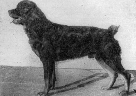 Ротвейлер (рис. 21). Первоначально эта порода называлась «ротвейлерской мясницкой собакой», так как ее разводили и держали мясники, перегонявшие гурты скота. Только в начале девятисотых годов, когда началась заводская работа с этой породой, ей было присвоено современное наименование. Ротвейлеры выносливы, неприхотливы и успешно применяются в качестве караульных и розыскных собак, а также для транспортировки грузов на небольшие расстояния, обычно в хозяйстве своих владельцев.
