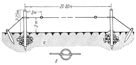 1 — опора (козел), 2 — хомут, 3 — проволока диаметром до 8 мм, 4 — оттяжка, 5 — штырь, 6 — дополнительная оттяжка