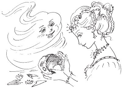 Королева надела на голову золотой обруч, украшенный сверкающими розами из рубина и листьями из зелёного изумруда. Она спустилась в сад и пошла навстречу Морганде.