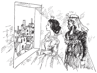Белоснежка стояла у высокого окна. Она не сводила глаз с заснеженной дороги. Зима украсила деревья блестящими ледяными цепями и ожерельями.