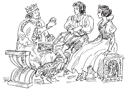 В эту минуту в высокое стрельчатое окно влетела большая летучая мышь с горящими зелёными глазами. Она опустилась на ковер перед троном и тотчас превратилась в придворную даму в пышном зелёном платье.