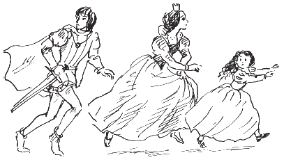Исхлёстанная ветвями, с красными полосами на лице, выбежала наконец Морганда из леса. Её драгоценная мантия была изорвана, корона скатилась с головы и осталась висеть на ветке где-то в чаще леса.