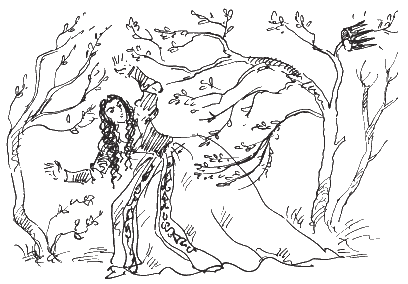 Но едва королева Морганда ступила на зелёную тропинку, как тут же стройная берёза больно хлестнула её гибкой веткой по плечу. Ель растопырила свои тяжёлые лапы, стараясь её уколоть.