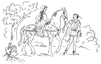 Солнце уходило за лес Грюневельт. В чаще уже скопились густые прохладные тени. Но вот на дорогу, ведущую к замку Тэнтинель, вышел принц Теодор, держа под уздцы своего коня, на котором сидела Белоснежка.