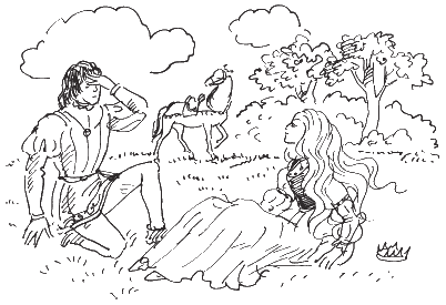 «Что с ней? Глаза её закрыты. Но она жива! Щёки алеют, как лепестки мака. По одежде и украшениям видно, что она знатного рода. Нет, она принцесса! Вон откатилась в сторону маленькая корона. Где же тогда её служанки и придворные дамы? Видно, принцесса вышла ненадолго погулять и упала в обморок. Весеннее солнце так обманчиво. Что же делать? Её нельзя оставить одну в этом пустынном месте. Здесь рыщут хищные звери, а в чаще гнездятся разбойники».