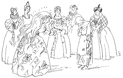 Высокие двери распахнулись, и в зал вбежала Белоснежка. На ней было всё то же бедное залатанное платье. Но она откинула покрывало на плечи, и все замерли, ослеплённые её красотой и прелестью.